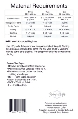 Do not redistribute, sell or copy the pattern, it is for personal use only. Quilts may be made and sold from this pattern on a non-commercial basis. If you sell quilts made from this pattern please credit the Nomadic Quilter LLC.