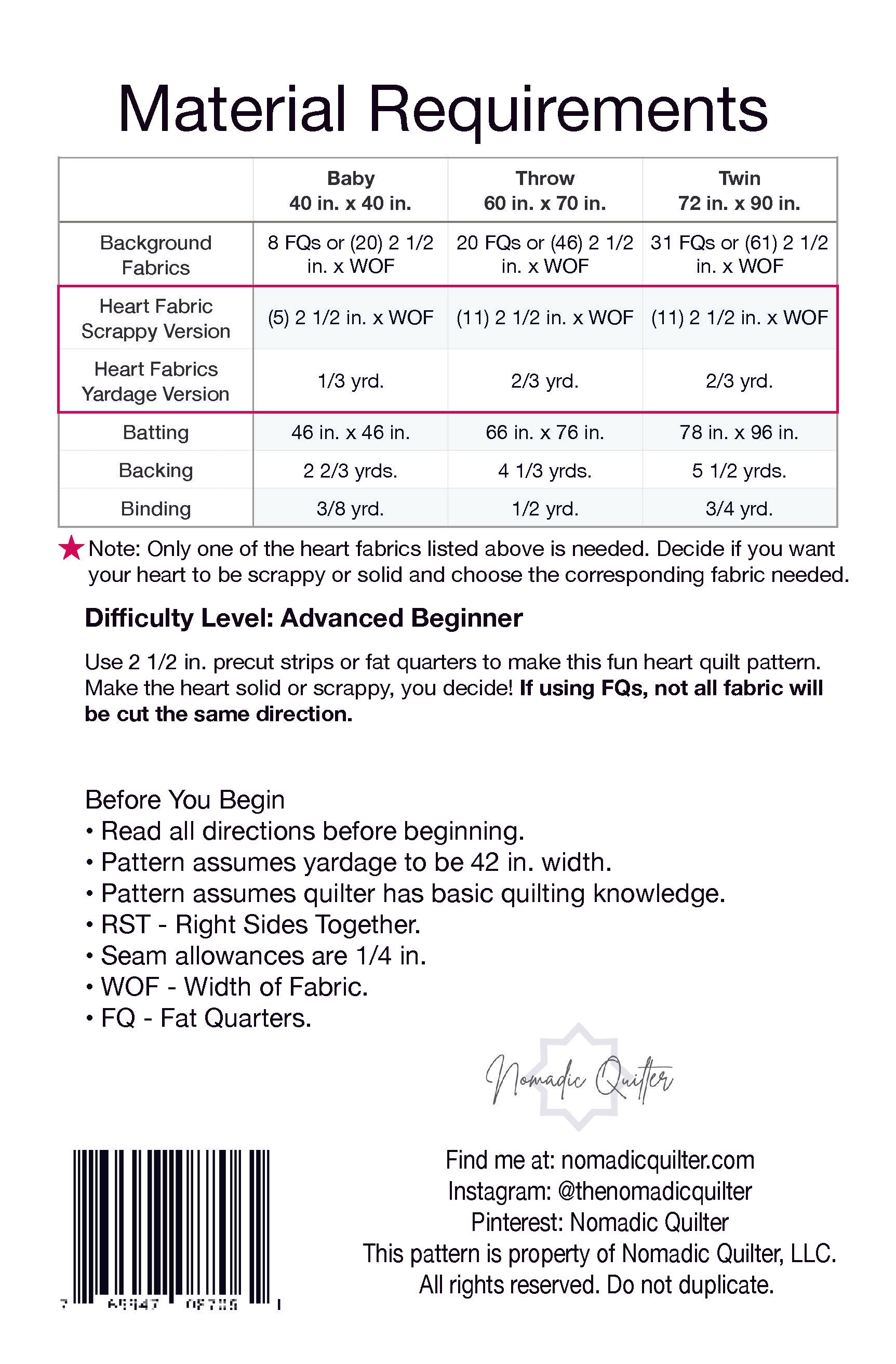 Do not redistribute, sell or copy the pattern, it is for personal use only. Quilts may be made and sold from this pattern on a non-commercial basis. If you sell quilts made from this pattern please credit the Nomadic Quilter LLC.