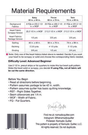 The Jelly Heart Quilt Pattern is designed for the beginner quilter in mind. This fast and precut friendly quilt pattern lets you choose the look you want by giving you the option of a scrappy or solid heart. Use Jelly Rolls or a fat quarter bundle and yardage... You decide on the colors and get sewing!