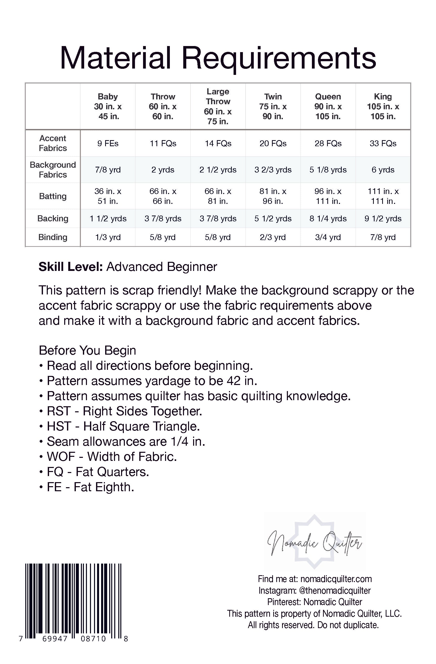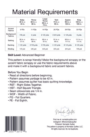 Do not redistribute, sell or copy the pattern, it is for personal use only. Quilts may be made and sold from this pattern on a non-commercial basis. If you sell quilts made from this pattern please credit the Nomadic Quilter LLC.