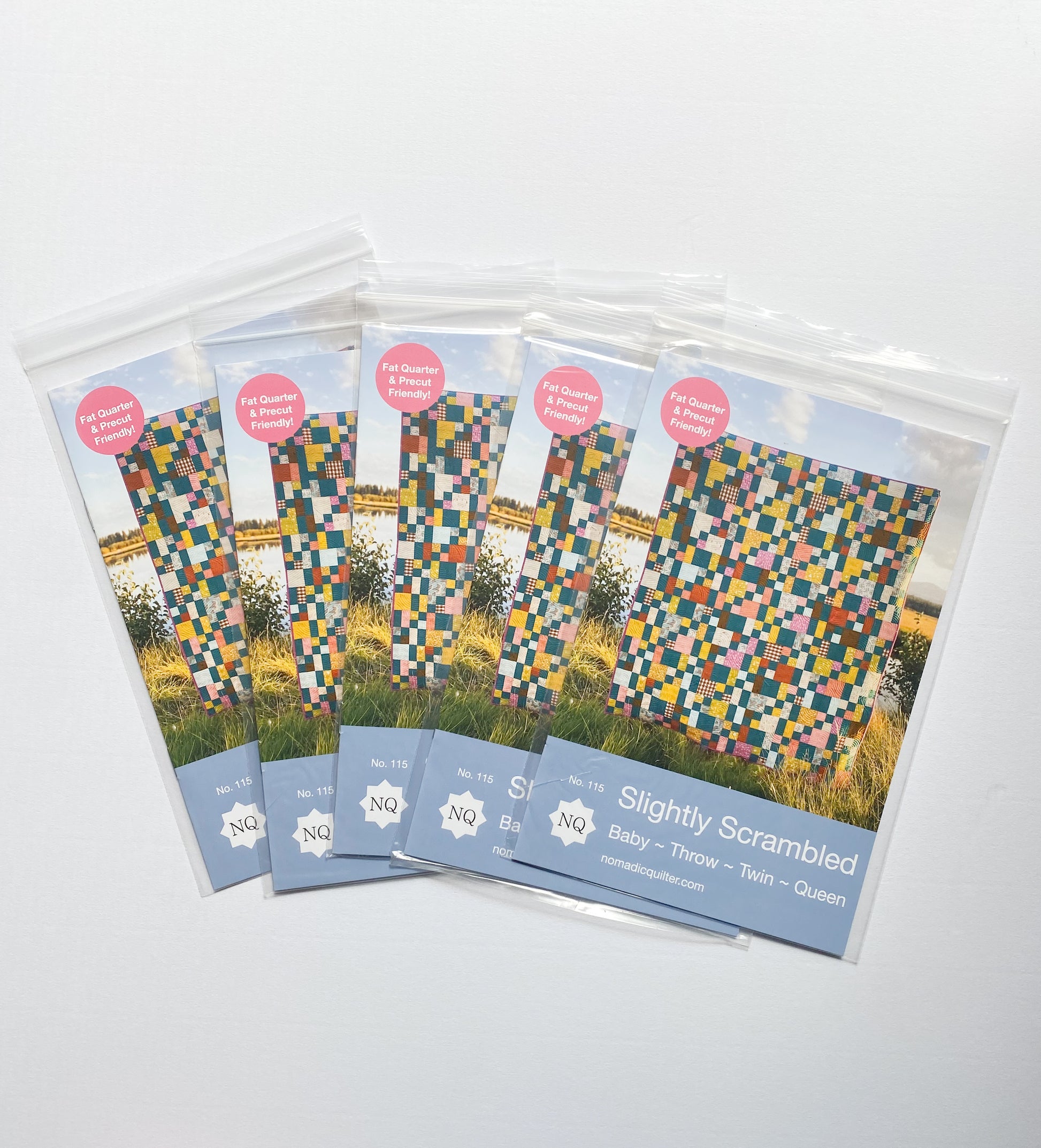 Slightly Scrambled is a fun, modern quilt pattern for the beginner quilter. This quilt can be scrappy or more organized depending on which version you make. Use precuts, fat quarters, yardage or scraps.